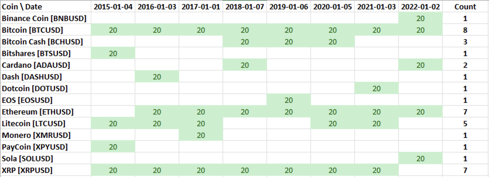 In April last year we created an index-like portfolio of major cryptocurrencies; it was constructed using the five coins with the highest market cap each year (measured by year-end) and then held for one year). This approach has shown interesting results over more than seven years of analysis, basically doubling the return of Bitcoin alone and outperforming equities.