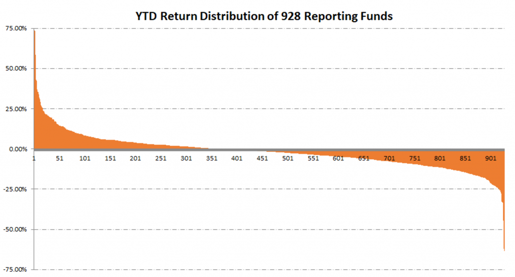 Funds reporting through June on the NilssonHedge database, a public database of hedge fund returns, shows the industry split in half during the first six months of the year. The average positive and the average negative returns of the 928 funds that NilssonHedge has data for through June are the same to within a basis point: 7.82% vs -7.83%, with negative returns being a majority (about 2/3rds or 562 of all returns).